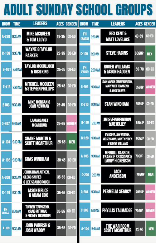 All Adult Small Groups meet Sunday at 9:30 AM.